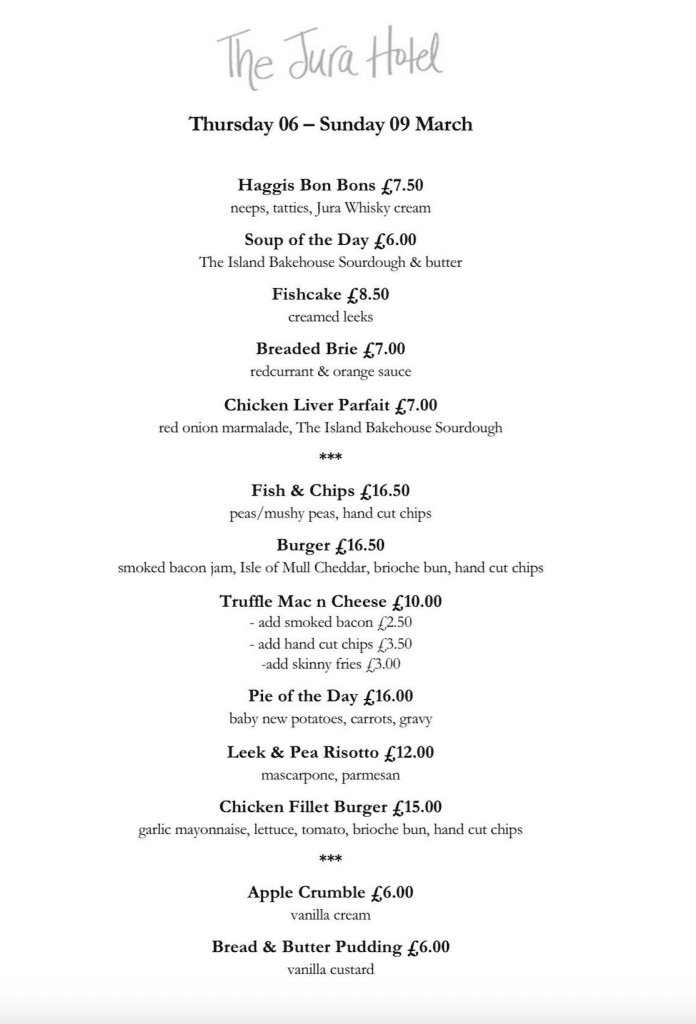 For up-to-date information on opening times and what’s been served try the Jura Community Page on Facebook